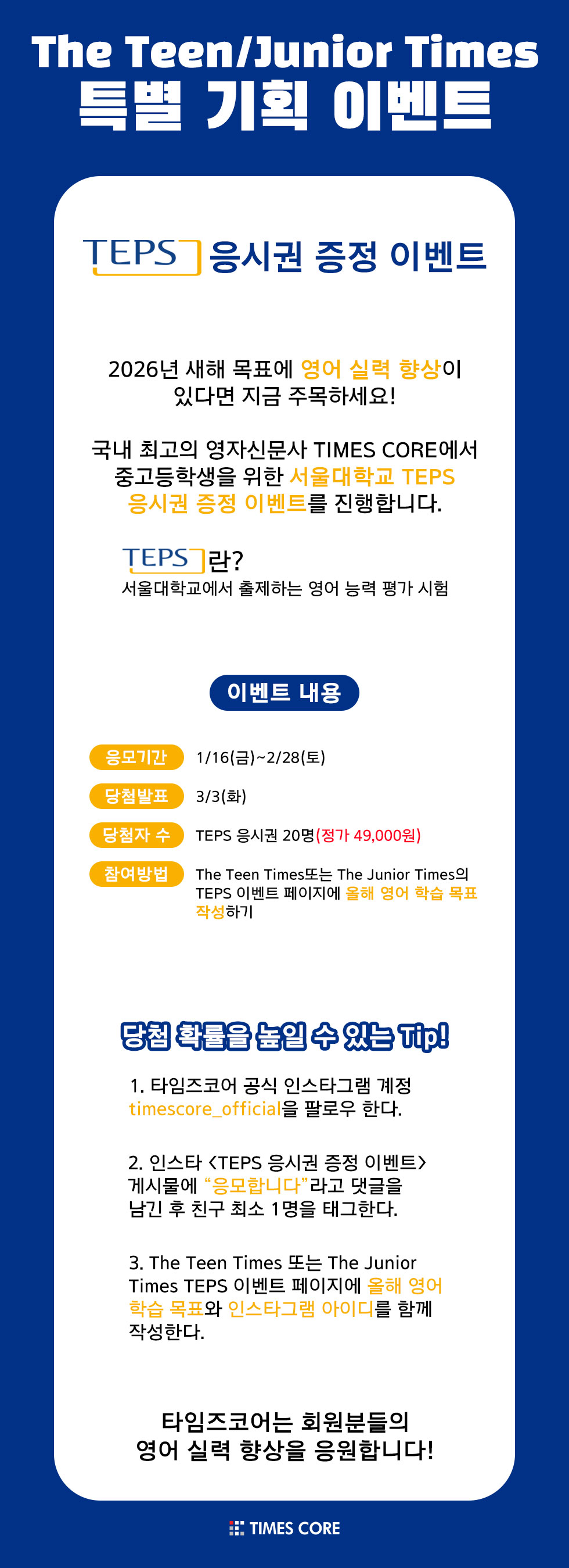 올해엔 주니어타임즈를 보면서, 영어 실력을 업그레이드하려고 합니다! 기사도 재미있지만, 지면에 문제가 있어서 기사를 제대로 이해했는지 체크할 수 있어서 좋아요. 제일 좋아하는 섹션은 Trend입니다. 일주일에 다는 못 읽지만, 최소 하루에 한 개씩은 읽어보려고 해요. 열심히 읽다보면, 지금보단 나아지겠죠? TEPS 시험도 나중에 꼭 응시해서 실력을 체크해볼 거에요! 앞으로도 이런 이벤트 많이 해주세요! 감사합니다